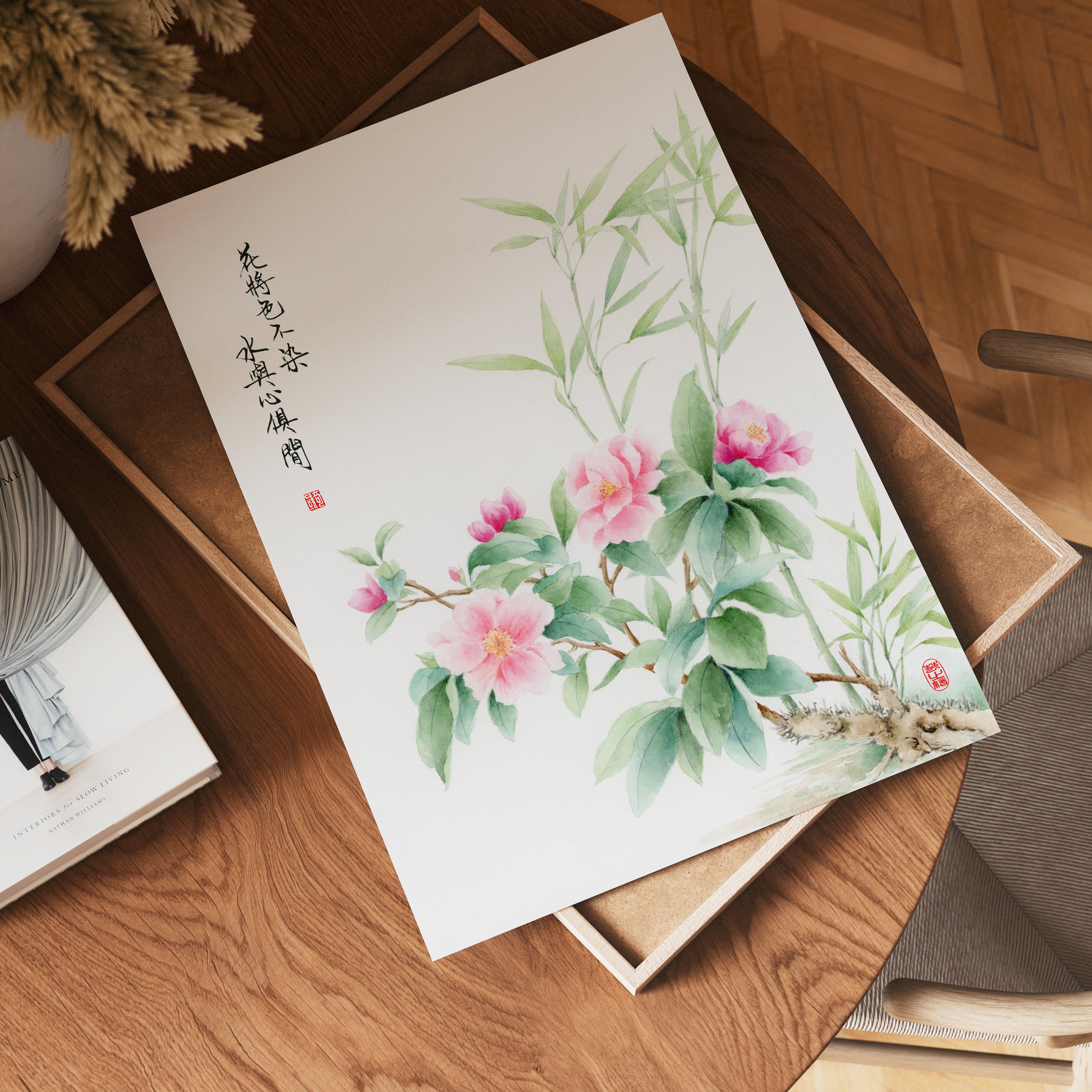 Timeless Camellia | Oriental Camellia Watercolor Art Print with Chinese Poem